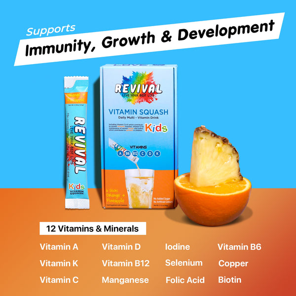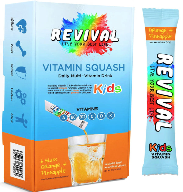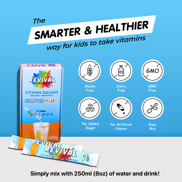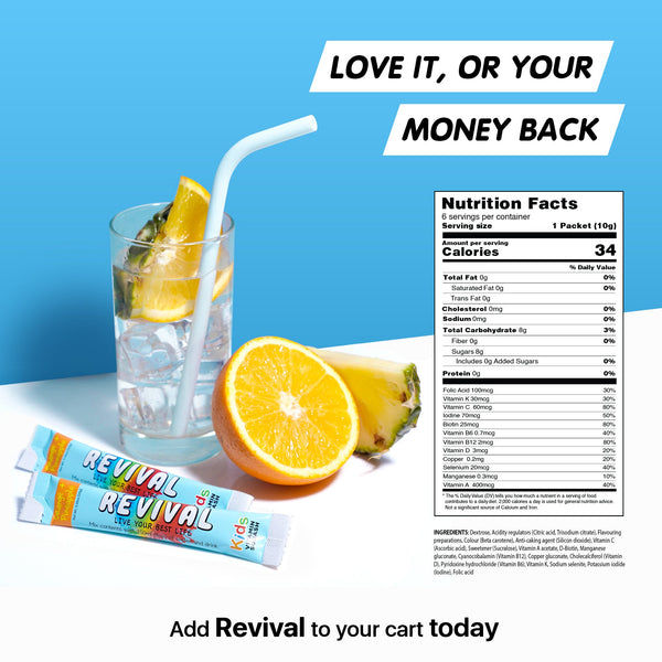 Revival Kids combine le goût et le rafraîchissement d'une boisson avec les avantages d'un supplément multivitaminé.